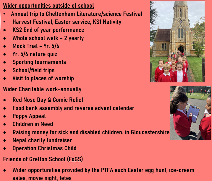 At Gretton Primary School, we believe it is important to teach the children to recognise and accept difference. We have a duty to prepare them for modern life in Britain. In school and their future workplace they will be working alongside peers and colleagues of different race, religion, sex, age, disability and sexual orientation and it is vital that future generations are able to accept differences, accept the views of others and treat each other with respect, even if they disagree. We expect the children to express their views with kindness and consideration for the feelings of others.